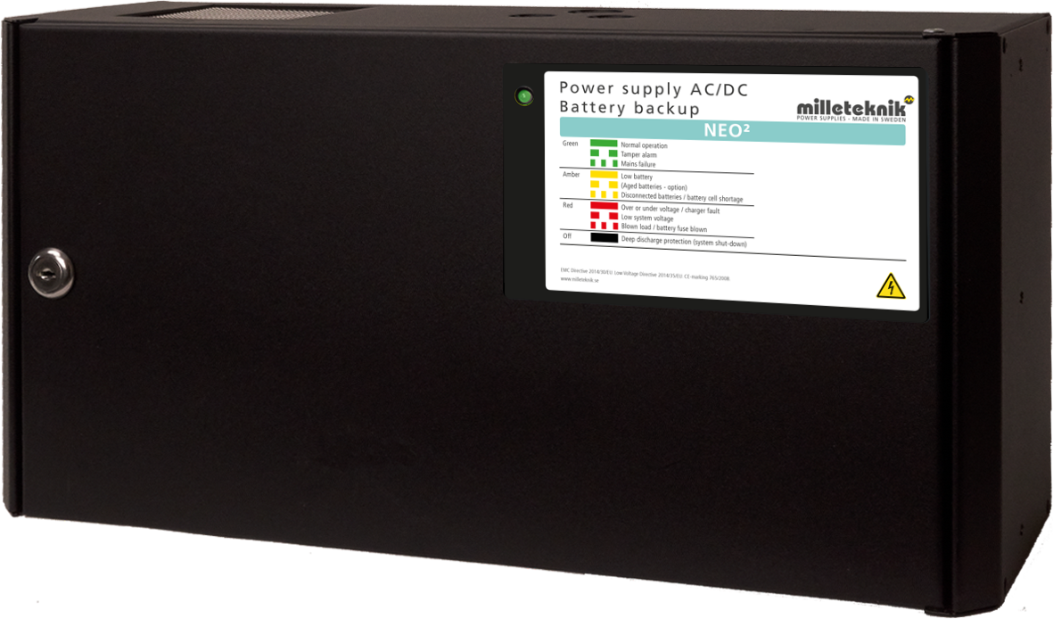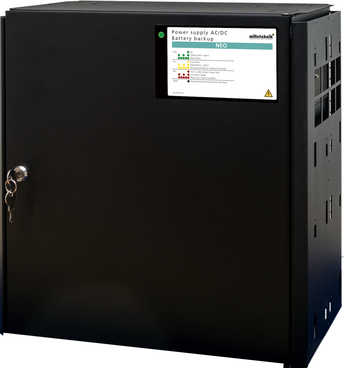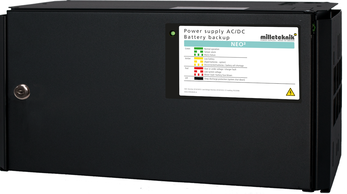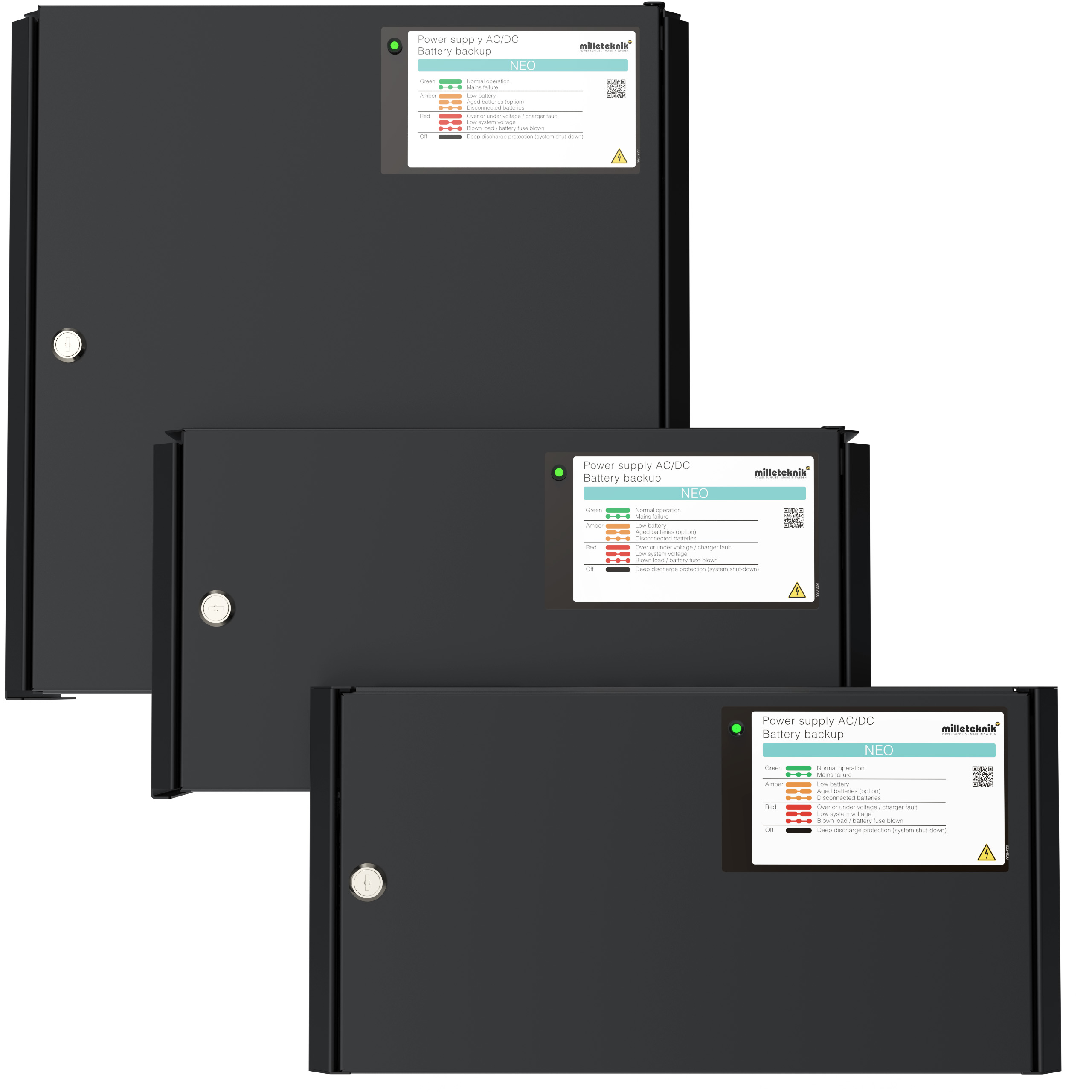 The NEO series is used in security facilities where the requirements are higher but where communication to the parent system is not required. More flexibility, more alarm functions, longer spare operating times and higher loads are the hallmark of the NEO battery backup series. The NEO series battery packs have controlled charging* that prevents batteries from being overcharged and significantly extends their life. NEO has intelligent charging which means that when the batteries are fully charged, they will be put in electronic standby mode for up to 20 days or when the battery voltage has reached 26.7 V. By discharging the batteries in a controlled way and recharging them cyclically (instead of not using them), the service life is extended by up to 50%. The batteries automatically connect in less than 50 microseconds, if needed. NEO can be supplemented with a battery box to extend the spare operating time. The battery box shall be placed under the battery backup and connected via a cable provided with the battery box. The battery box can accommodate 4x 14Ah batteries per each battery box. Mounting: NEO can be mounted on wall or in 19″ racks, reversible brackets included. Installation and Deployment: Fixed Installation. Battery types: Lead acid, AGM batteries. Connectable battery boxes: Two battery boxes. Typical uses: